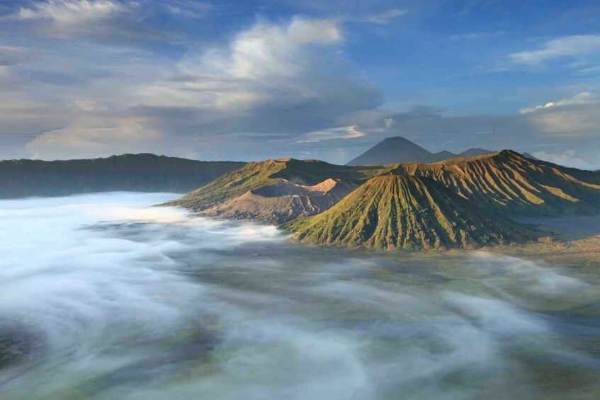 Day 2 starts very early in the morning with a classic Mount Bromo sunrise experience. You will transfer to a 4x4 jeep and head to one of the best sunrise viewpoints inside Bromo Tengger Semeru National Park. As the sun rises, you’ll witness Mount Bromo, Mount Batok, and Mount Semeru creating an unforgettable volcanic panorama. After sunrise, the jeep adventure continues across the Sea of Sand, followed by a short walk and stair climb to the rim of Bromo Crater. The journey then continues to the lush Savanna and Teletubbies Hill, where rolling green landscapes contrast beautifully with the volcanic surroundings.