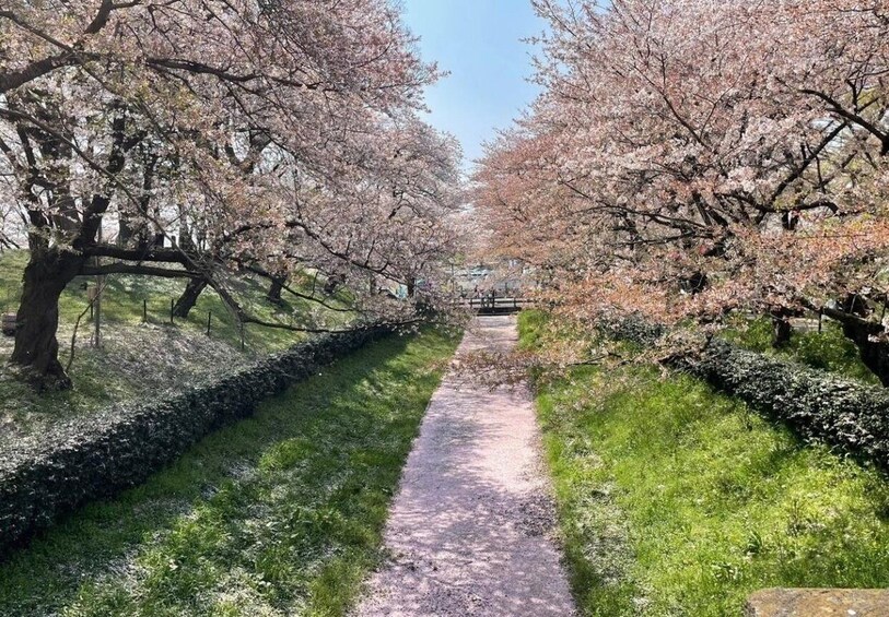 The tour then moves to Gongendo Tsutsumi, one of the most impressive cherry blossom spots in the Kanto region. Stretching along the riverbank, hundreds of cherry trees bloom simultaneously, forming a long tunnel of pink petals. In contrast, bright yellow rapeseed flowers grow nearby, adding vivid colour to the landscape. Guests can walk freely along the embankment, take photos, or simply pause to enjoy the open views and gentle spring breeze. This stop offers a classic yet spacious hanami experience, ideal for those who prefer a calmer environment away from crowded city parks.