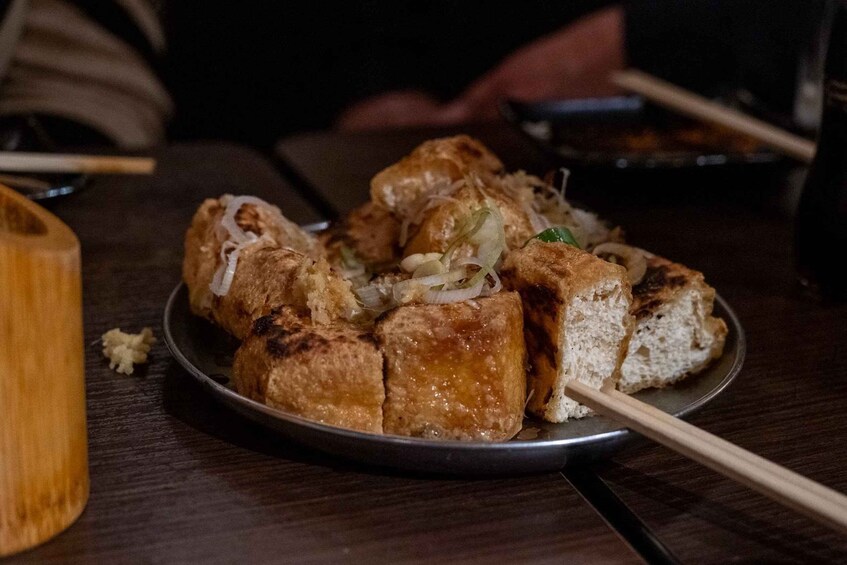 We end the tour in the “Sankaku Chitai” (Triangle District), a maze of narrow alleys filled with tiny bars, neon lights, and retro charm. With its underground, laid-back vibe, this area is a beloved local nightlife spot. Enjoy a final drink at a cosy bar as you reflect on the night’s experiences.