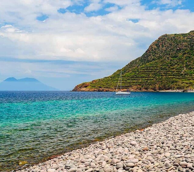 “fili” (threads).columns of lava stone modulated by the erosion and sinking of the ancient volcanic rocks. We will spend some time to the Scoglio Della Jalera and Malopasso, before to disembark to Alicudi, the least populated Archipelago's island remained untouched by the mass tourism. We will continue sailing towards Filicudi and we will take a selfie in Canna, a majestic 70 metres high volcanic neck and then along the south coast to look at the Grotta del Bue Marino the largest cave in the Archipelago. Here we will have a refreshing swim. At the end we will dock at the Port of Filicudi for a walk among the colourful shops and have a drink on the most suggestive terraces of the islands. We will resume navigation towards