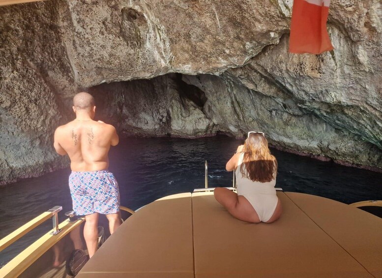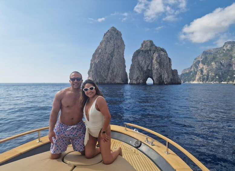 The itinerary also includes a passage between the legendary Faraglioni, imposing rock formations that emerge from the water creating a postcard-perfect setting for a romantic kiss under the arch of the Middle Faraglione.