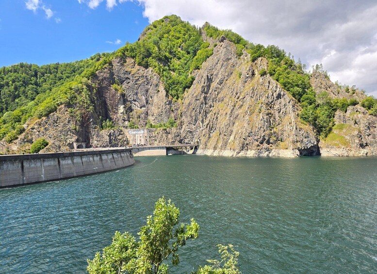 Vidraru Dam, built in the 1960s, stands as one of the country’s largest hydroelectric structures, holding the waters of Lake Vidraru.