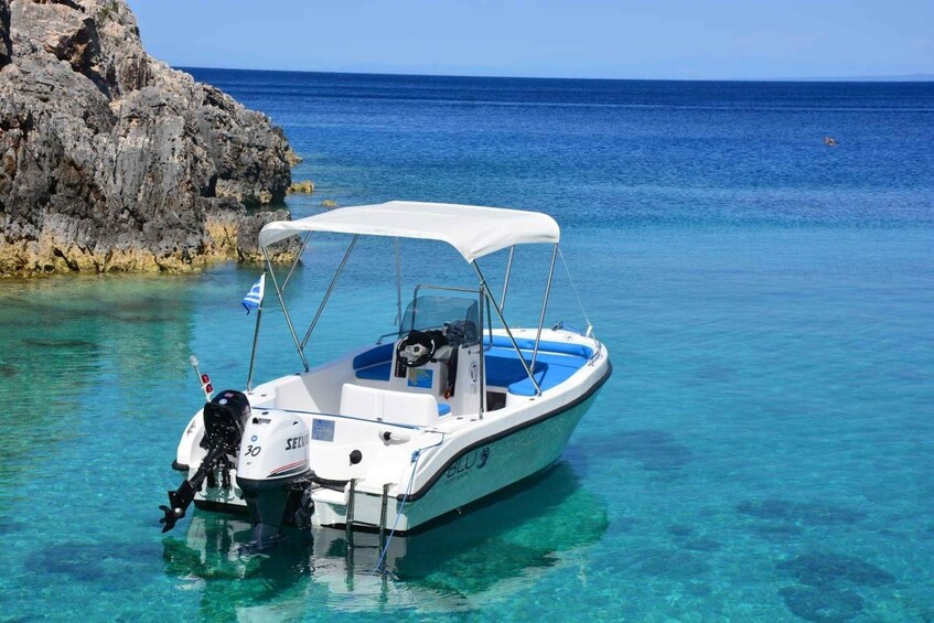 Head north to explore the spectacular Blue Caves. Jump in for a swim or snorkel, and discover hidden coves along the coastline. Optional stops include Xigia Beach, Pelagaki, and Alykes, giving you complete freedom to create your own route.