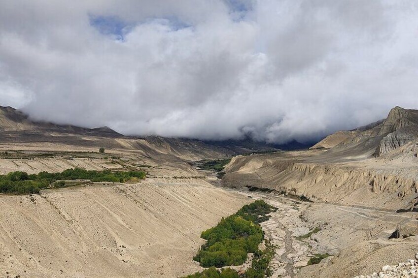 Trek back from Dhakmar to Kagbeni, retracing your steps through familiar trails. The return journey offers a unique opportunity to appreciate the Mustang landscape from a different perspective. As you approach Kagbeni, enjoy the serene environment and the traditional architecture of this charming village. Kagbeni, with its historical significance and Buddhist culture, is a perfect place to reflect on your journey. Spend the night in this peaceful village, where the vibrant culture and beautiful surroundings offer a sense of tranquility.