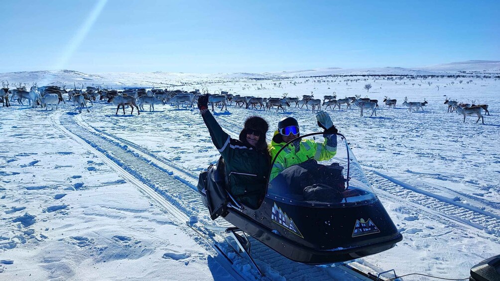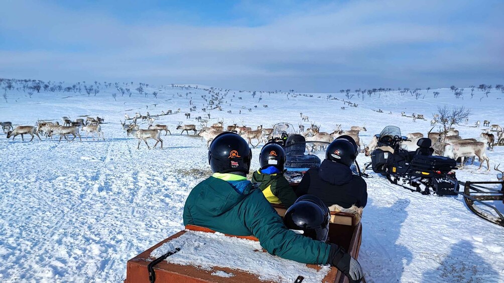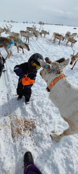 The tour is usually about 3 hours, depending on the location of our herd. We can pick you up within 10 km from Utsjoki village, or you can arrive directly at our storage at 10 AM. We always provide extra winter gear and helmets for the tour. From our storage, guests travel in a sleigh pulled by guide´s snowmobile to the fells. We will spend about 2-3 hours in the wilderness, and then return to our storage. Guide will drop you off back at your accommodation if needed.