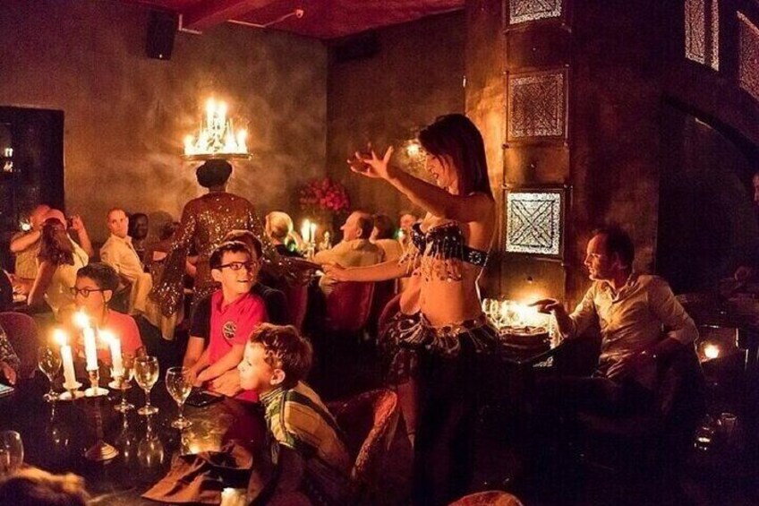 The cabaret features 5–6 dynamic performances blending live music, theatrical acts, and mesmerising belly dancing, bringing authentic Middle Eastern artistry to life in a way that feels both spectacular and genuine. Guests can explore the venue, soak in the vibrant décor, and enjoy the lively atmosphere before the show begins.