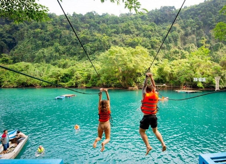 07:40 - 07:45 You will be picked up at hotel in Dong Hoi or in Phong Nha from 08:45 -09:00 and drive you to the Dark cave. Participate in the many adventure activities: longzipline, swimming, kayaking, adventure course, water zipline,… The venture into the cave in the dark for cave exploring and mud swimming.